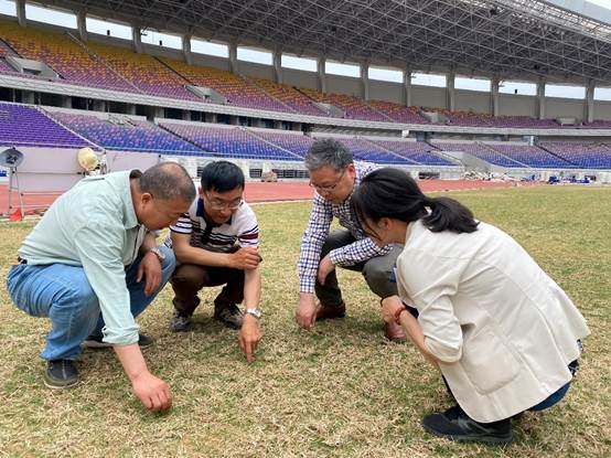 句容草坪研究院生产的耐践踏草坪草。杨志民与现场施工人员进行了交流,并结合该草坪草的特点对草坪建植现场存在的问题及后期的养护管理给出了指导意见和建议。