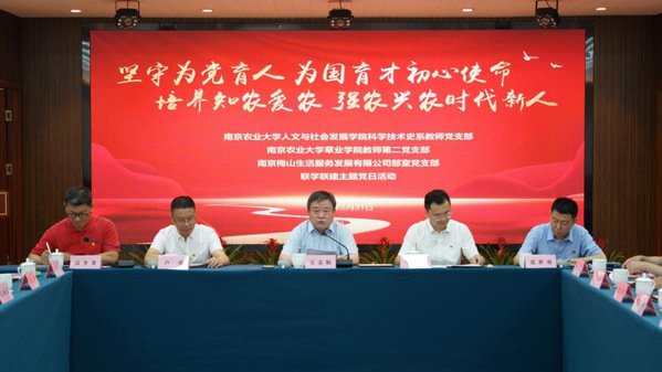 教师第二党支部书记张风革,与南京梅山生活服务发展有限公司综合管理部总经理、部室党支部书记张学芳,共同签署了党支部联学联建协议。会上,吴昊和张风革分别领读习近平总书记2023年5月29日在二十届中央政治局第五次集体学习上的讲话,以及《习近平关于“三农”工作的重要论述学习读本》部分章节的内容,与会者围绕学科特色和研究基础、专业交叉融合发展方向、学科发展方向、人才培养模式、未来工作设想等多个方面发言交流。科学技术史系主任沈志忠带领大家参观南门农艺园博物馆,并讲解中华农业历史。