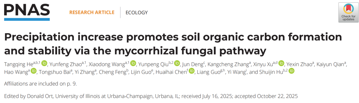 近日,H动漫 胡水金教授团队在《美国科学院院刊》(PNAS)上发表了题为“Precipitation increase promotes soil organic carbon formation and stability via the mycorrhizal fungal pathway”的研究论文。该研究依托黄土高原半干旱草地长期全球变化定位试验站,系统揭示了未来降雨增加情景下土壤有机碳形成与稳定的关键微生物驱动机制,取得重要进展。