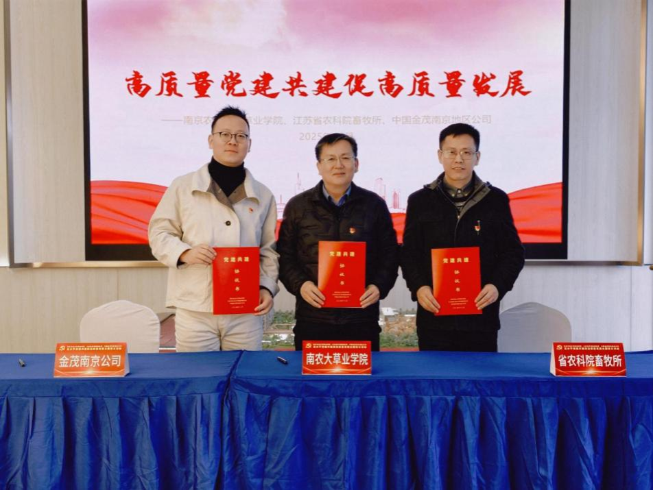 党委书记戴廷波、江苏省农科院畜牧所党总支副书记杜平、中国金茂南京地区公司党总支书记吴艳涛共同签署《党建共建合作协议书》,未来将努力打造“组织共建、资源共享、活动共联、发展共谋”的长效机制。