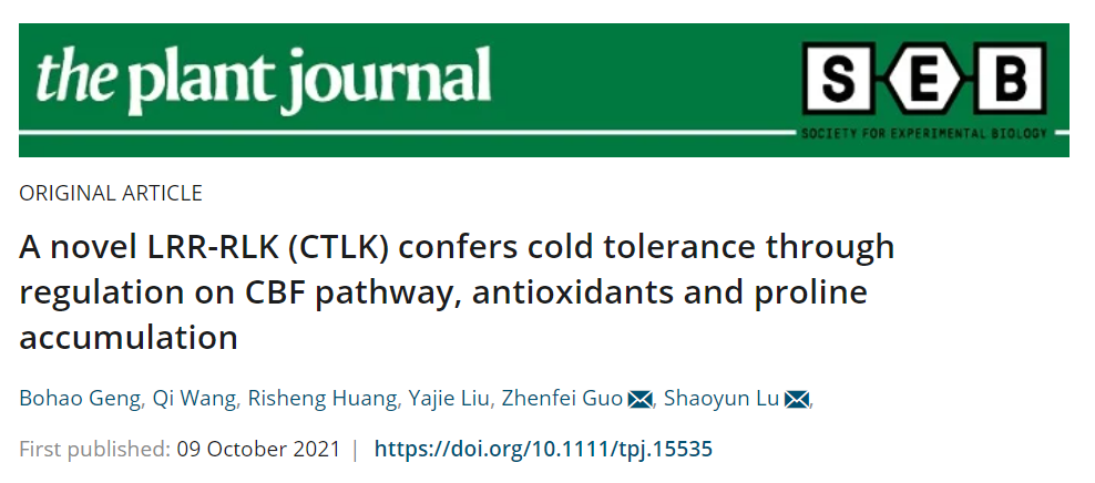 郭振飞教授与华南农业大学亚热带农业生物资源保护与利用国家重点实验室卢少云教授课题组合作在国际植物领域著名杂志The Plant Journal上在线发表了题为A novel LRR-RLK (CTLK) confers cold tolerance through regulation on CBF pathway, antioxidants and proline accumulation的研究论文。该研究从蒺藜苜蓿中鉴定出一种新型富含亮氨酸重复类受体蛋白激酶CTLK, 其通过调控CBF低温响应途径、抗氧化防御和脯氨酸积累来赋予苜蓿耐寒性。