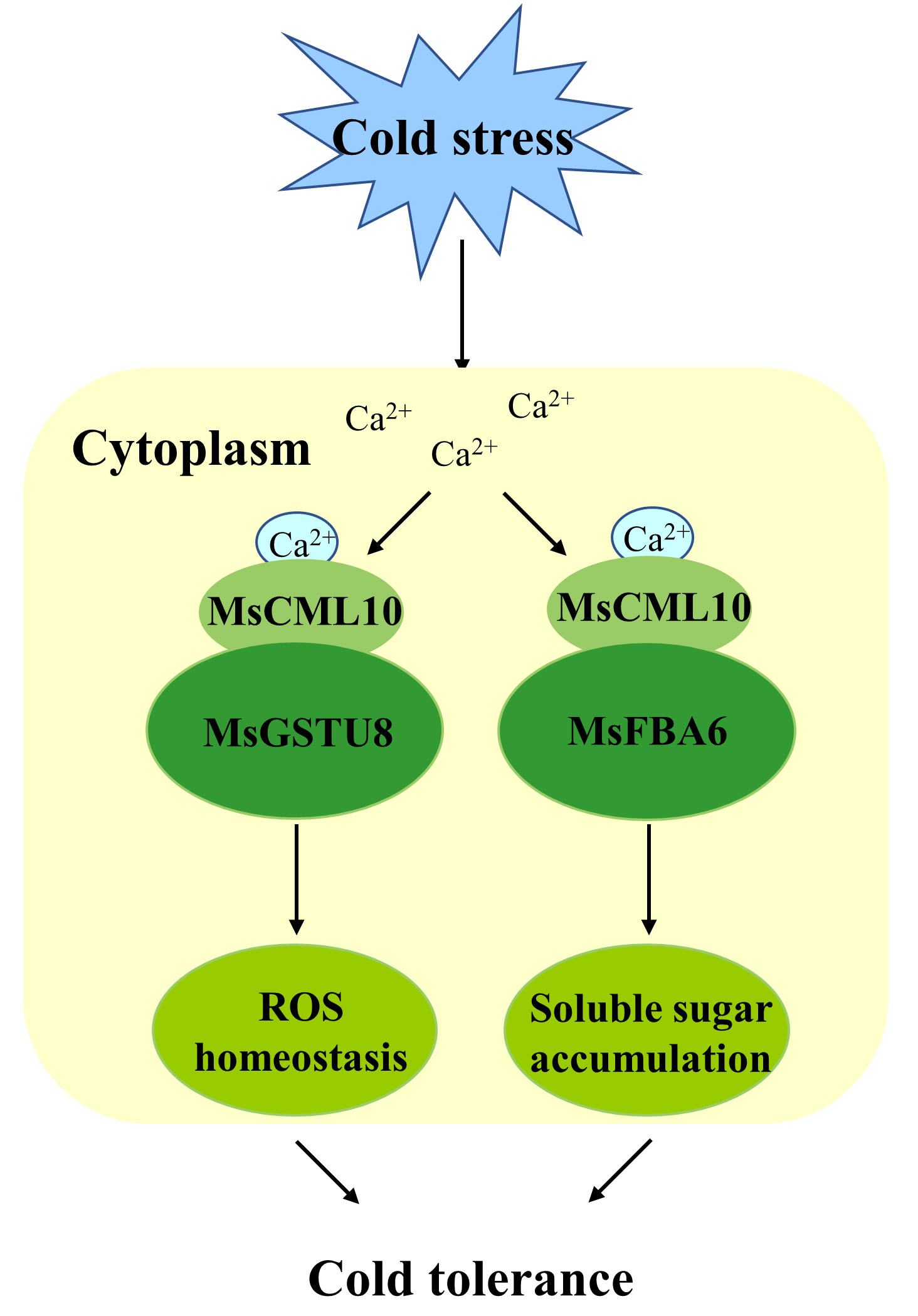 综上所述,该研究揭示了MsCML10调控紫花苜蓿耐寒性的分子机制:低温下MsCML10结合Ca2+后而活化,分别与细胞质酶MsGSTU8和MsFBA6互作,促进植物维持ROS稳态,增加糖的积累,进而调控耐寒性。