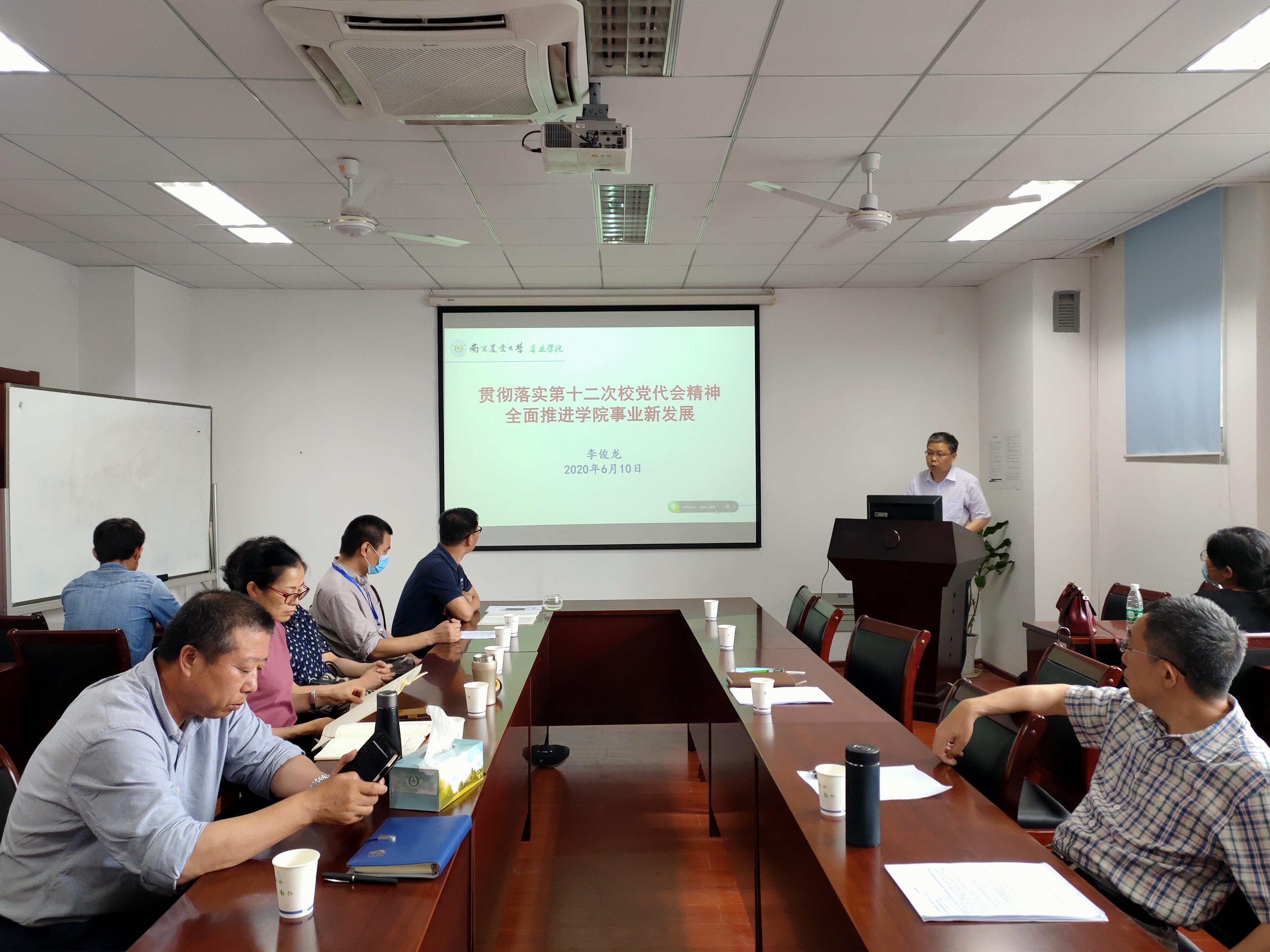 学院总支书记李俊龙做了题为《贯彻落实第十二次校党代会精神,全面推进学院事业新发展》的专题报告。他首先简要介绍了第十二次校党代会概况以及党代会重要意义,接着从十一次党代会以来学校工作回顾、新时代学校的历史使命和战略目标、全面推进学校事业高质量发展举措、坚持党对学校工作的全面领导等四方面详细解读了党代会报告,最后结合学院实际,就学院如何贯彻党代会精神、如何对标对表推动学院事业发展谈了个人的想法和体会。他要求大家要切实做好党代会会议精神的学习,要对照学校党代会报告提出的未来发展目标,扎实做好各项工作,要发扬钉子精神,全面落实好会议精神,力促学院各项事业再上新台阶,为学校早日建成农业特色的世界一流大学贡献智慧和力量!
