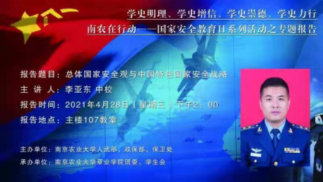 人武部、政保部、保卫处开展“学史明理、学史增信、学史崇德、学史力行、南农在行动——国家安全日系列活动之专题报告”。为调动积极分子参与活动积极性,提高党性修养,研究生第二党支部党员唐小月带领支部积极分子参加了此次报告会。