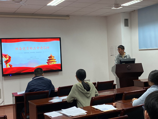按照党组织接收党员的程序:首先,预备党员王虎同志从对党的认识,入党动机,历史背景,个人经历以及在校表现几个方面向大会作了简短汇报。与此同时,王虎同志也诚恳地回答了与会党员提出的问题。
