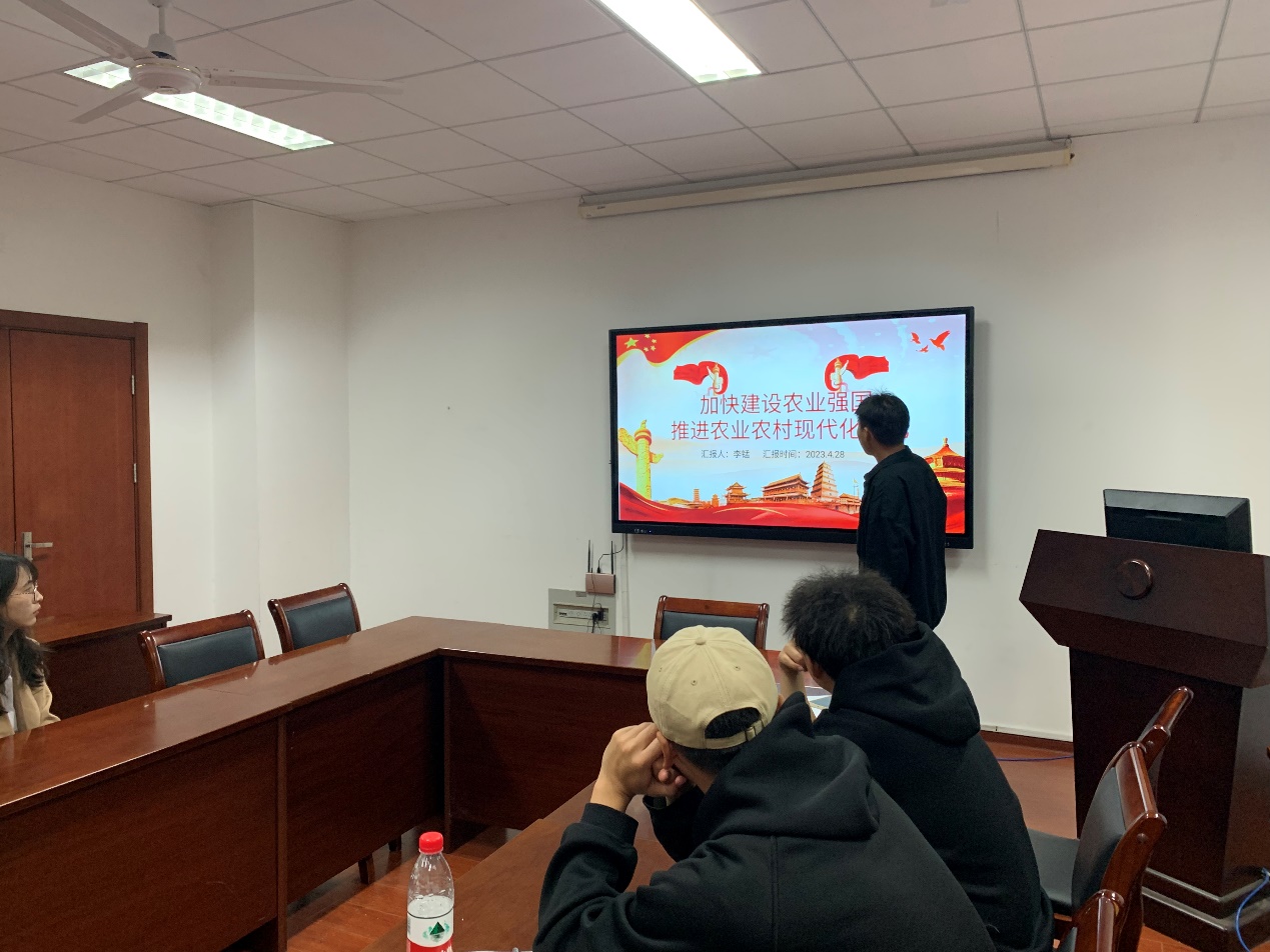 由李锰同志带领大家学习加快建设农业强国,推进农业农村现代化主题学习。李锰同志首先介绍了我国农业现代化目前的发展情况,随后带领集体学习了我国建设农业强国的理论意义和现实意义,深刻感悟习近平总书记对建设农业强国,推进农业农村现代化的指导意见。最后强调了我们身为农业大学的学生,更应该利用自身优势,发挥党员的带头作用,为建设农业强国添砖加瓦。