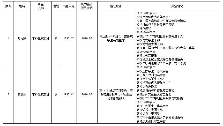 根据H动漫 党员发展工作安排,经转正答辩,党支部讨论,结合个人成绩、综合测评以及获奖任职等综合表现,经院党委讨论审核,拟对本科生2名中共预备党员进行转正,具体名单如下: