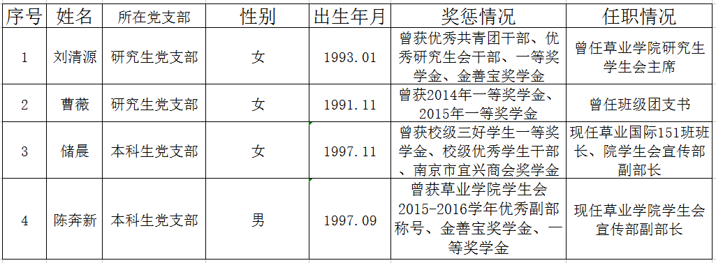 根据H动漫 党员发展工作安排,经由各团支部推选,党建班考核,党支部讨论,结合个人成绩等综合表现,经院党总支讨论审核,2016年12月拟发展中共预备党员共4名,具体名单如下: