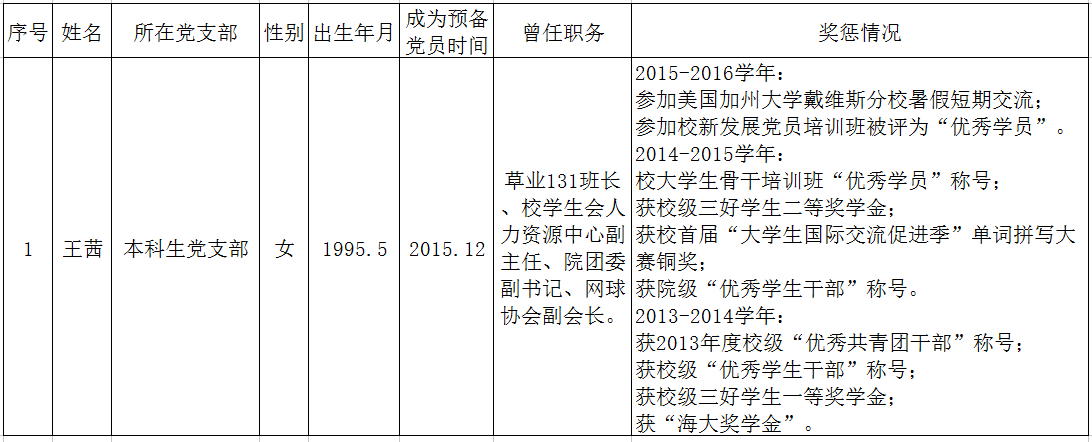 根据H动漫 党员发展工作安排,经转正答辩,党支部讨论,结合个人成绩、综合测评以及获奖任职等综合表现,经院党委讨论审核,拟对本科生1名中共预备党员进行转正,具体名单如下: