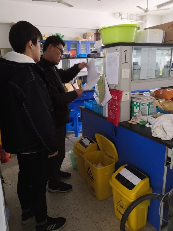 学院党总支副书记兼副院长高务龙和学院安全管理员逐一检查了各团队实验室,这次检查重点检查内容有:危化品的储存使用和台账记录、特种设备的安全审验和持证操作情况、大功率仪器设备安全使用、用水用电安全、实验废弃物的收集管理、消防安全等。