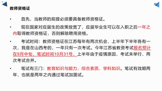 卫玲玲从“教师资格证的简介”、“校园招聘”、“公办学校教师招聘用工性质及待遇”和“教师招聘公告来源及考试流程”四个方面进行本次分享,为有意向成为教师的同学们提供了许多宝贵的经验和信息。