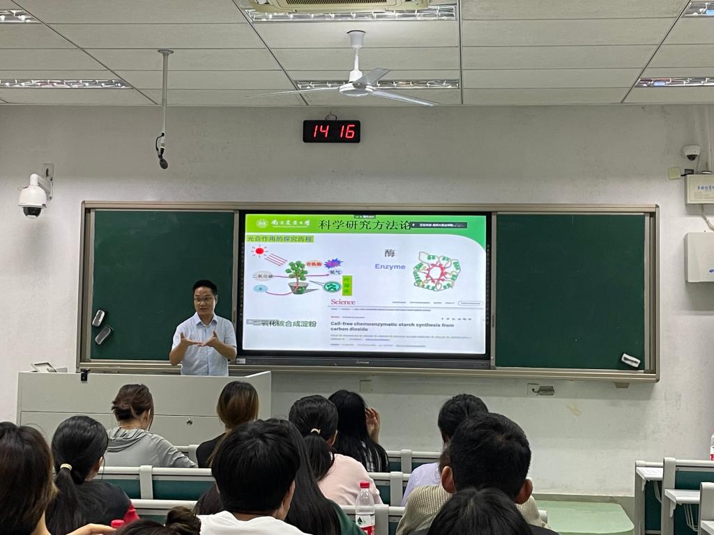 校友蔡韬博士的人工合成淀粉的例子开始,阐释了规范的科学研究的一般规律,详细介绍了科学研究工作中从观察现象,发现问题,提出假说,查阅文献,设计实验,处理数据,分析结果到论文撰写全过程的基本方法与原则。陈老师报告的第二部分着重介绍了从事科学研究工作内含的学术道德准则和必须遵守的基本规范。他结合近年来国内外发生的有较大影响的违背学术诚信与学术规范的典型案例,要求研究生在研究生生涯和学术研究工作中秉持科学、诚信品质。他在报告结尾总结说:科学研究的学术训练和科学道德规范,是以科学为业的“两个轮子”,是在科学殿堂中探寻求索的“两个翅膀”,并举双翼才能学有所得。