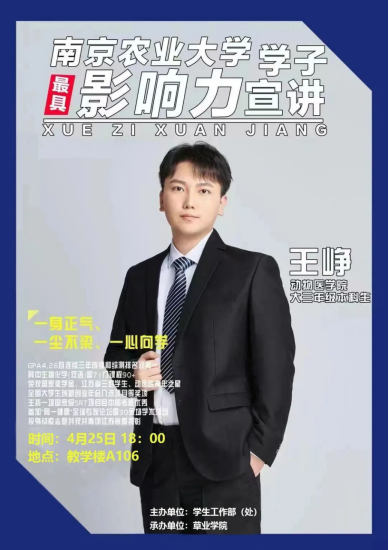 有幸邀请到动物医学专业的王峥学长开展宣讲讲座,为同学们的学习生活与未来发展指明方向。欢迎各位同学抓住机会,踊跃参加活动,在最风华正茂的青春时代,砥砺向前,不负韶华,冲破迷茫与彷徨,向着梦想的方向进发,成为更好的自己!