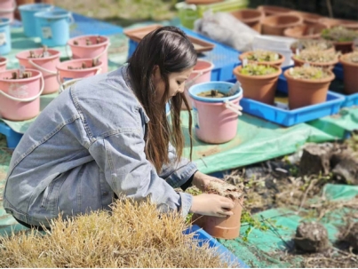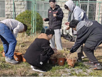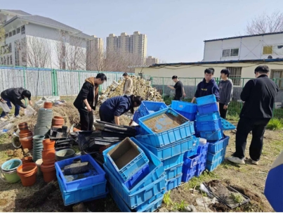 志愿者们在活动过程中认真聆听刘君老师的要求,听从指挥通力合作,首先将杂乱的PVC管中的土倒出,清理干净摆放在一起,又将散乱的花盆里的土和枯草取出,将花盆收集起来,并将所有需要的实验材料摆放整齐。