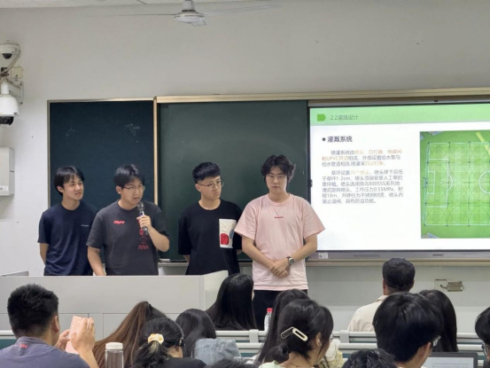 经过初赛的层层筛选,共有六支队伍进入决赛。参赛选手按照抽签顺序依次上台进行PPT汇报,向评委老师及观众展示自己团队的足球场设计方案,并接受评委老师的现场提问,进行答辩。