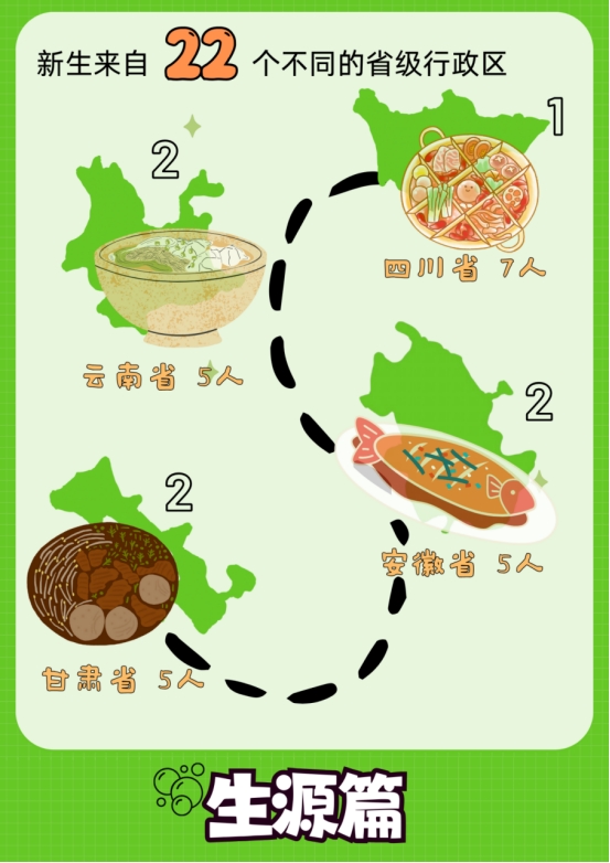60位同学来自22个不同的省级自治区,快来pick你的老乡吧!其中来自四川省的同学人数排名第一,共有7人;云南省、安徽省和甘肃省人数并列第二,分别有5人。