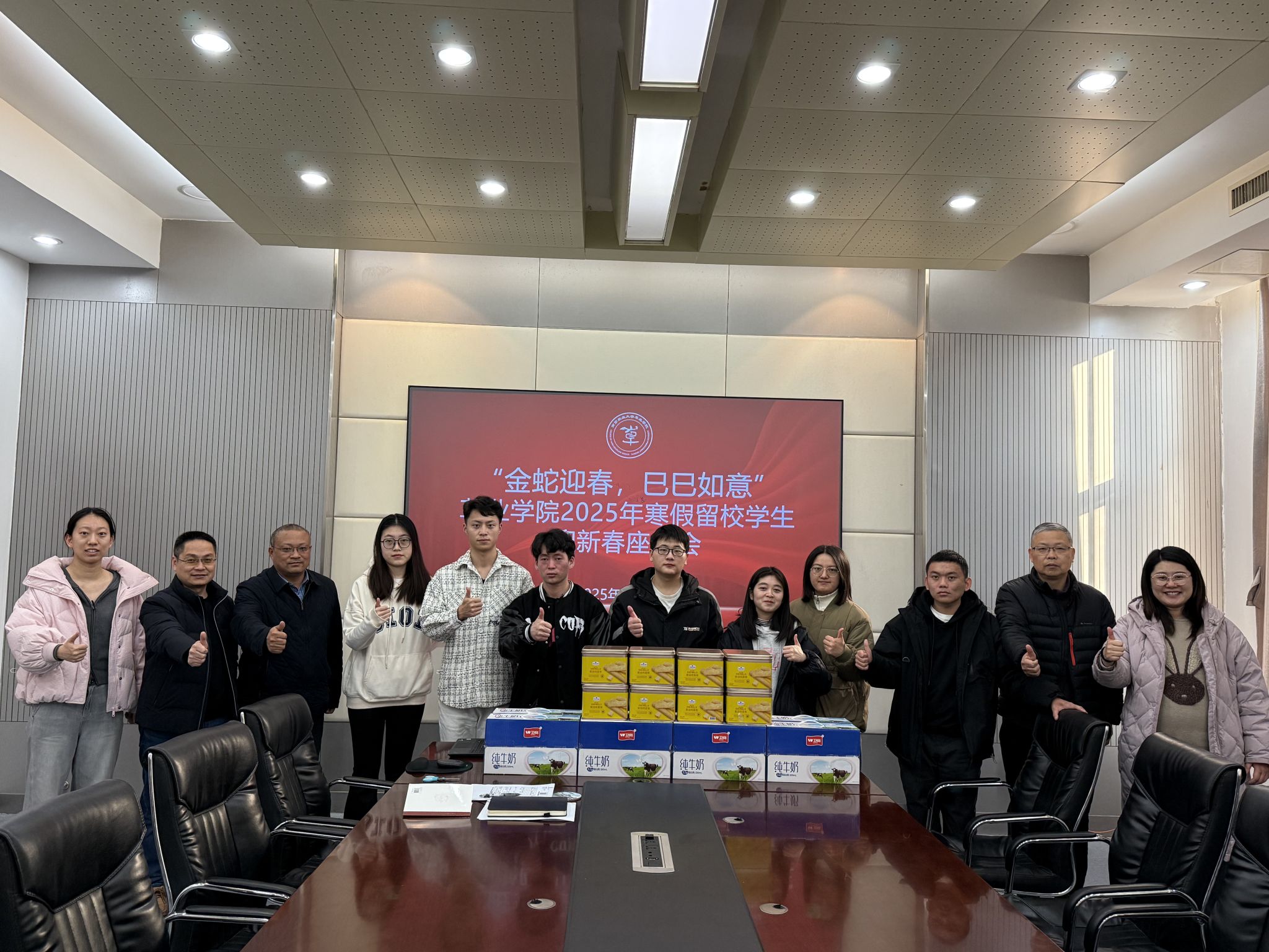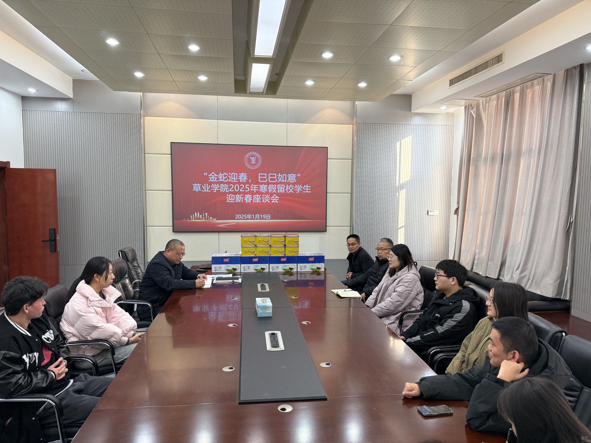 于理科南楼F122会议室举办“金蛇迎春,巳巳如意”2025年寒假留校学生迎新春座谈会活动。院党委书记李俊龙,副书记、副院长韩立新,副院长陈煜,院团委书记、辅导员武昕宇,院本科生辅导员李宇宣及留校学生参加了此次活动。