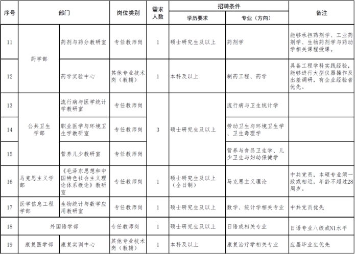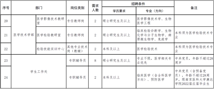 应聘人员应满足岗位所需的专业知识、能力或技能条件,符合招聘岗位的要求,具体岗位及要求详见《南京医科大学康达学院2022年公开招聘岗位需求表(第一批次)》(见附件)。