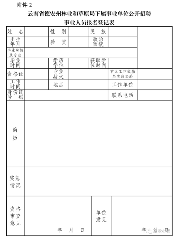 附件1:云南省德宏州林业和草原局下属事业单位公开招聘事业人员岗位、人数及资格条件 附件2:云南省德宏州林业和草原局下属事业单位公开招聘事业人员报名登记表