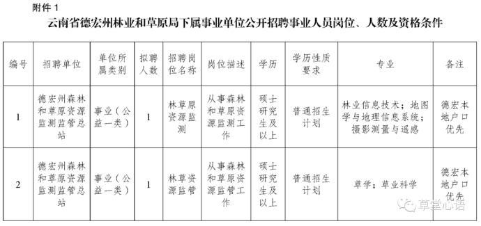 德宏州森林和草原资源监测监管总站2名,具体岗位、条件要求等详见附件1。