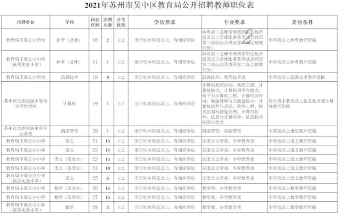 根据《省教育厅省人力资源和社会保障厅关于进一步做好全省中小学校新进教师公开招聘工作的意见》(苏教规〔2016〕1号)有关规定,经研究,2021年苏州市吴中区教育局下属公办学校公开招聘教师298名。现将《2021年苏州市吴中区教育局公开招聘教师公告》(以下简称《公告》)公布如下: