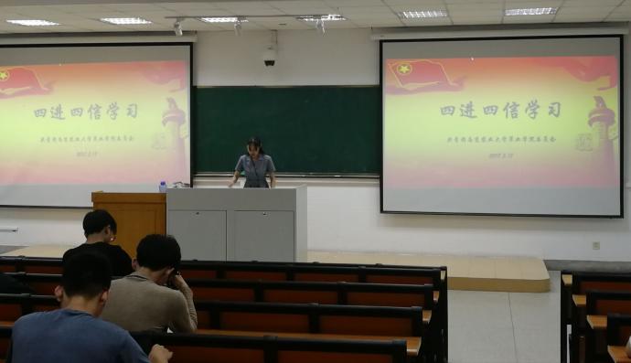 2018年5月18日晚8:30,H动漫 全体本科生于教学楼C301进行了关于"四进四信"的集体学习。本次集体学习由H动漫 团委副书记储晨主持,出席的老师有H动漫 党委副书记高务龙。