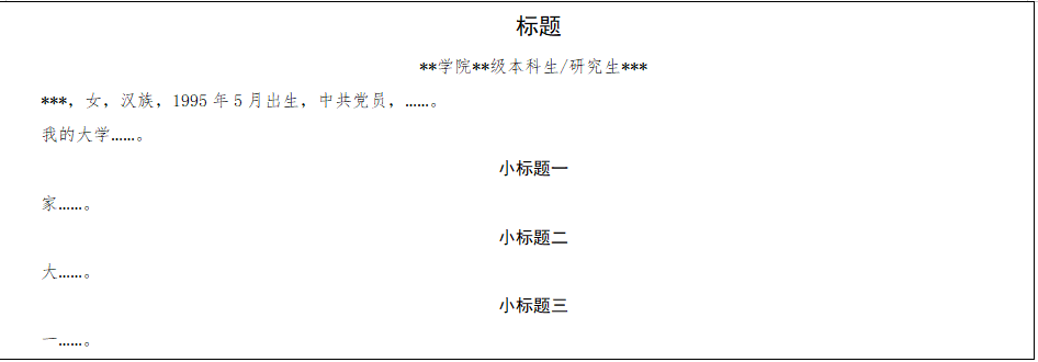 2.事迹正文:2000字左右,事迹材料以第一人称行文。事迹正文包括标题与内容两部分。文章标题要简练精确,能集中反映中心思想。文章内容要事迹感人、格调向上、主题突出、语言流畅,以某一方面的突出表现或一个典型事迹为主线,展开有血有肉的故事性叙述,尽量避免将思想品德、学习成果、实践创新、感恩回报等几方面内容罗列成文。毕业生可以阐述获得奖学金对自己个人成长发展的帮助。