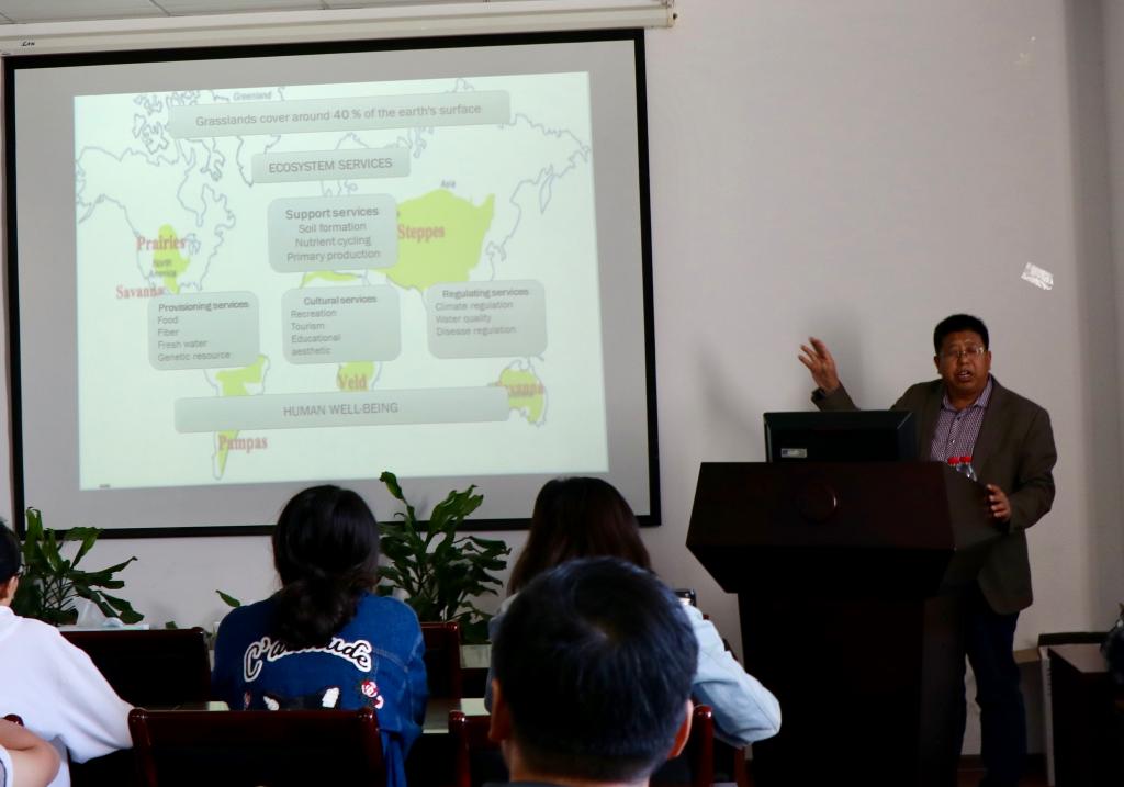 韩国栋教授作了题为“长期放牧实验与牧场适应性管理”的报告。他深入浅出地介绍了其团队天然草地放牧实验的巧妙设计及科学假说验证,并指出了未来可能深入开展的研究工作,使相关专业的师生得到了非常深刻的启迪与指导,大家兴趣浓厚。最后,韩教授与学院师生对相关学术问题进行了交流和探讨。